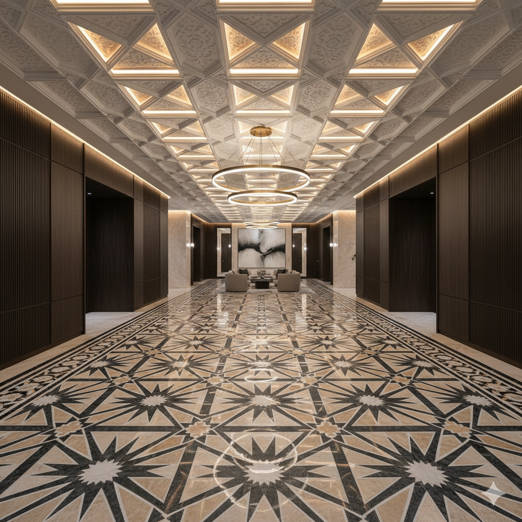 Marble and Stone Inlay: Water-jet cutting technology allows precise execution of complex geometric patterns in contrasting marble colors, creating luxurious floor designs that reference traditional Islamic mosaics while achieving contemporary precision and scale.